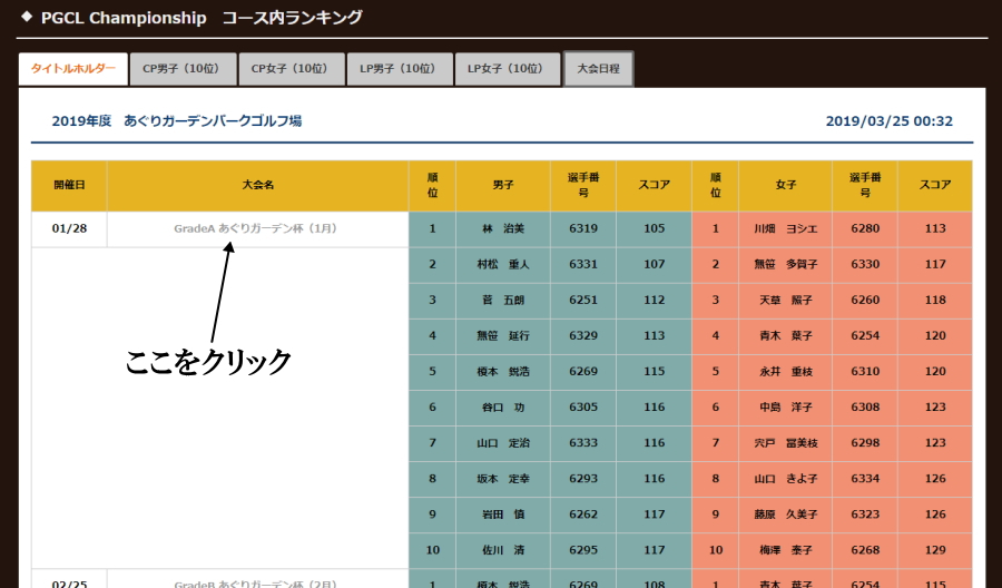 下図の部分をクリックすると、その大会の成績上位10名までが表示されます。